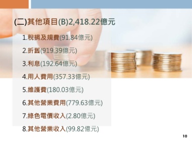 (二)其他項目(B)2,418.22億元 1.稅捐及規費(91.84億元) 2.折舊(919.39億元) 3.利息(192.64億元) 4.用人費用(357.33億元) 5.維護費(180.03億元) 6.其他營業費用(779.63億元) 7.綠色電價收入(2.80億元) 8.其他營業收入(99.82億元) 10