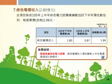 7.綠色電價收入(2.80億元) 此項目係依105年上半年綠色電力認購實績數加計下半年預估數估 列,每度單價(含稅)1.06元。 1052F103-12 單位:億元 項目 105年下半年 105年上半年 差異數(A)-(B) 電價案(A) 電價案(B) 綠色電價收入 2.80 0.81 1.99 差異說明: 積極推廣綠色電力認購,綠色電價收入預估數較上半年電價 案增加1.99億元。 18