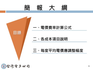 簡報大綱 目錄 一、電價費率計算公式 二、各成本項目說明 三、每度平均電價應調整幅度 1