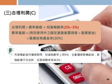 (三)合理利潤(C) 合理利潤=費率基礎 × 投資報酬率(3%~5%) 費率基礎=(有效使用中之固定資產重置現值+營運資金) ×最適自有資金率(30%) ‧ 有累積虧損待彌補期間,投資報酬率上限5%,全數彌補累積虧損;累 積虧損不存在時,投資報酬率降為3%。 20