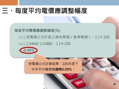 三、每度平均電價應調整幅度 每度平均電價應調整幅度(%) ={(按電價公式計算之應有單價/基準電價)-1 } ╳ 100 ={(2.5464/ 2.5488)-1 } ╳ 100 = -0.09% 按電價公式計算結果,105年度下 半年平均電價應調降0.09%。 23