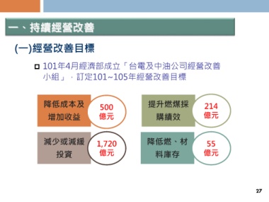一、持續經營改善 (一)經營改善目標 101年4月經濟部成立「台電及中油公司經營改善 小組」,訂定101~105年經營改善目標 降低成本及 500 提升燃煤採 214 增加收益 億元 購績效 億元 減少或減緩 1,720 降低燃、材 55 億元 料庫存 億元 投資 27