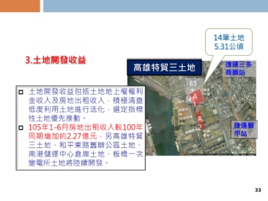 14筆土地 5.31公頃 3.土地開發收益 高雄特貿三土地 捷運三多 商圈站 土地開發收益包括土地地上權權利 85 捷運獅 金收入及房地出租收入,積極清查 大 高雄 甲站 低度利用土地進行活化,選定指標 性土地優先推動。 市圖 105年1-6月房地出租收入較100年 A樓 同期增加約2.27億元,另高雄特貿 廣 三土地、和平東路舊辦公區土地、 1停 南港儲運中心倉庫土地、板橋一次 A 變電所土地將陸續開發。 2 中鋼 總部 33