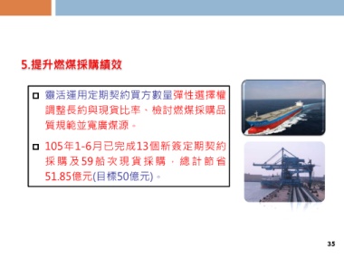 5.提升燃煤採購績效 靈活運用定期契約買方數量彈性選擇權 調整長約與現貨比率、檢討燃煤採購品 質規範並寬廣煤源。 105年1-6月已完成13個新簽定期契約 採 購 及 59 船 次 現 貨 採 購 , 總 計 節 省 51.85億元(目標50億元)。 35