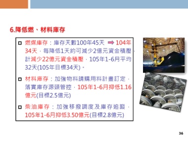 6.降低燃、材料庫存 燃煤庫存:庫存天數100年45天 104年 34天,每降低1天約可減少2億元資金積壓, 計減少22億元資金積壓,105年1-6月平均 32天(105年目標34天)。 材料庫存:加強物料請購用料計畫訂定, 落實庫存源頭管控,105年1-6月抑低1.16 億元(目標2.5億元) 柴油庫存:加強移撥調度及庫存追蹤, 105年1-6月抑低3.50億元(目標2.8億元) 36