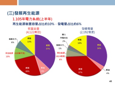 (三)發展再生能源 1.105年電力系統(上半年) 再生能源裝置容量占比約10%,發電量占比約6% 裝置容量 購入 發購電量 (4,122萬瓩) 汽電共生 (2,192億度) 抽蓄水力 核能 2% 核能 6% 13% 16% 抽蓄水力 燃氣 1% 燃氣 37% 34% 再生能源 (420萬千瓦) 再生能源 10% (62.6億度) 6% 燃煤 燃油 燃煤 燃油 26% 8% 37% 4% 41
