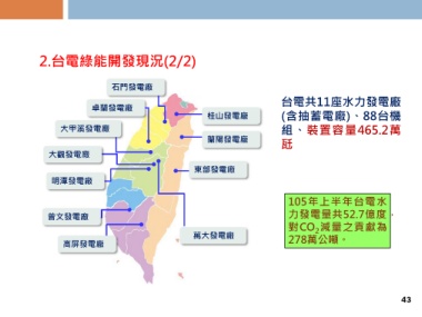 2.台電綠能開發現況(2/2) 石門發電廠 桂山發電廠 台電共11座水力發電廠 卓蘭發電廠 蘭陽發電廠 (含抽蓄電廠)、88台機 大甲溪發電廠 東部發電廠 組 、 裝 置 容 量 465.2 萬 大觀發電廠 瓩 明潭發電廠 105 年 上 半 年 台 電 水 力發電量共52.7億度, 曾文發電廠 萬大發電廠 對 CO2 減 量 之 貢 獻 為 高屏發電廠 278萬公噸。 43