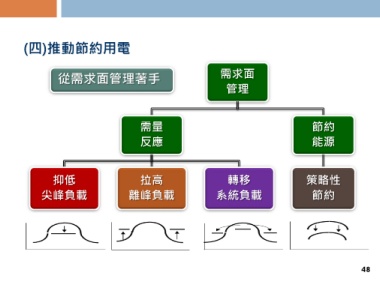 (四)推動節約用電 需求面 管理 從需求面管理著手 轉移 抑低 需量 系統負載 節約 尖峰負載 反應 能源 拉高 策略性 離峰負載 節約 48