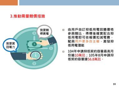 3.推動需量競價措施 我要競 由用戶自訂抑低用電回饋價格 標賣電 參與競比,得標後確實配合抑 低用電即可依報價扣減電費, 我要買 賦與用戶更多自主權,激發抑 回電力 低用電潛能 104年申請抑低契約容量最高月 份逾10萬瓩;105年8月申請抑 低契約容量達56.8萬瓩。 51