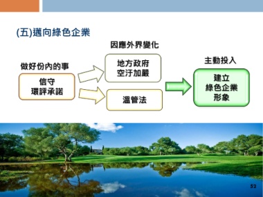 (五)邁向綠色企業 因應外界變化 主動投入 地方政府 建立 做好份內的事 空汙加嚴 信守 綠色企業 溫管法 形象 環評承諾 52