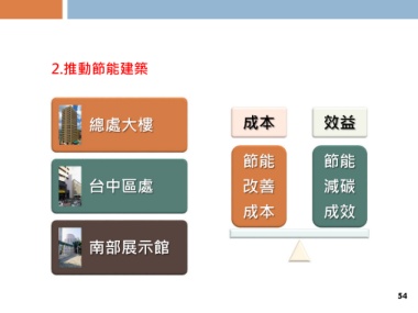 2.推動節能建築 成本 效益 總處大樓 節能 節能 台中區處 改善 減碳 南部展示館 成本 成效 54
