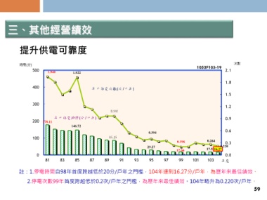 2.停電次數99年首度跨越低於0.2次/戶年之門檻,為歷年來最佳績效。104年略升為0.220次/戶年。