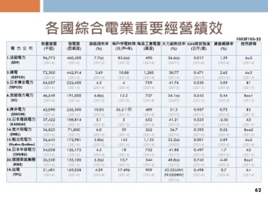 電力公司 裝置容量 發電量 線路損失率 每戶停電時間 每員工售電量 火力廠熱效率 CO2排放強度 資產報酬率 信用評等