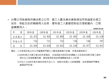 2.104年度正式員工較103年度增加,主係因配合核四封存調整人力及為有效解決員工退休