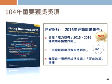 104年重要獲獎獎項 世界銀行-「2016年經商環境報告」 台灣「電力取得」2015、2016 NO.2 連續兩年獲世界第二 「供電可靠度及費率透明化」 滿分 我國唯一獲世界銀行採認之「正向改革」 指標 67