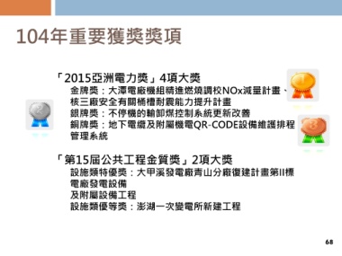 104年重要獲獎獎項 「2015亞洲電力獎」4項大獎 金牌獎:大潭電廠機組精進燃燒調校NOx減量計畫、 核三廠安全有關桶槽耐震能力提升計畫 銀牌獎:不停機的輸卸煤控制系統更新改善 銅牌獎:地下電纜及附屬機電QR-CODE設備維護排程 管理系統 「第15屆公共工程金質獎」2項大獎 設施類特優獎:大甲溪發電廠青山分廠復建計畫第II標 電廠發電設備 及附屬設備工程 設施類優等獎:澎湖一次變電所新建工程 68