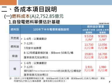 註:105年上半年電價費率檢討方案,油採Brent40.15美元/桶、氣採Brent41.33美元/桶估計,煤採 7