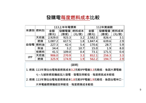 1. 燃氣: 113年預估台電每度燃氣成本3.2元較IPP電廠3.3元略低,係因大潭電廠