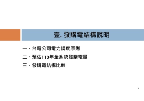 壹. 發購電結構說明 ⼀、台電公司電⼒調度原則 二、預估113年全系統發購電量 三、發購電結構比較 2