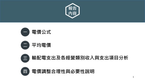 報告 內容 一 電價公式 二 平均電價 三 輸配電支出及各經營類別收入與支出項目分析 四 電價調整合理性與必要性說明 1