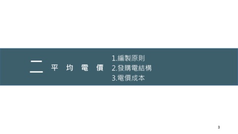 二 平 均 電 價 1.編製原則 2.發購電結構 3.電價成本 3