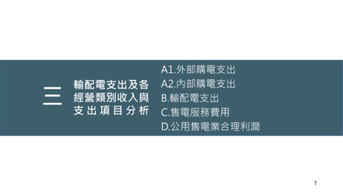 A1.外部購電支出 三 輸配電支出及各 A2.內部購電支出 經營類別收入與 B.輸配電支出 支 出 項 目 分 析 C.售電服務費用 D.公用售電業合理利潤 7