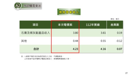A2 其 他 營 業 收 入 單位:億元 項目 本次電價案 112年實績 差異數 石膏及煤灰副產品收入 3.80 3.61 0.19 其他 0.44 0.55 -0.12 合計 4.23 4.16 0.07 註:1.細項不等於合計係因四捨五入之故,不調整尾差。 2.本表皆不含非電業之電路出租收入、承攬電業運維收入等。 17